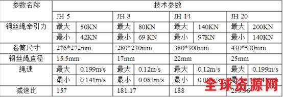 型号:JH-8,JH-14,JH-20,JH-30 牵引力(KN):80,140,200,300 绳速(m/s):0.10,0.11,0.124,0.13 容绳量(m):80,130,170,220 绳径(mm):Φ15.5,Φ22,Φ24.5,Φ31 电机功率(kw):7.5,11/18.5,18.5/22,45 外型尺寸(mm):1600*530*670,2060*680*935,2560*968*797,3300*1075*1034 机重(kg):650,1450,2500,4460